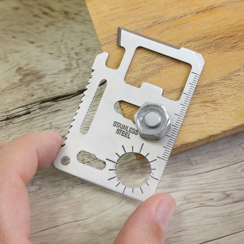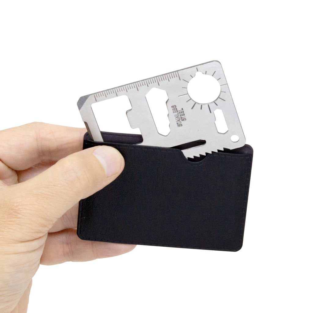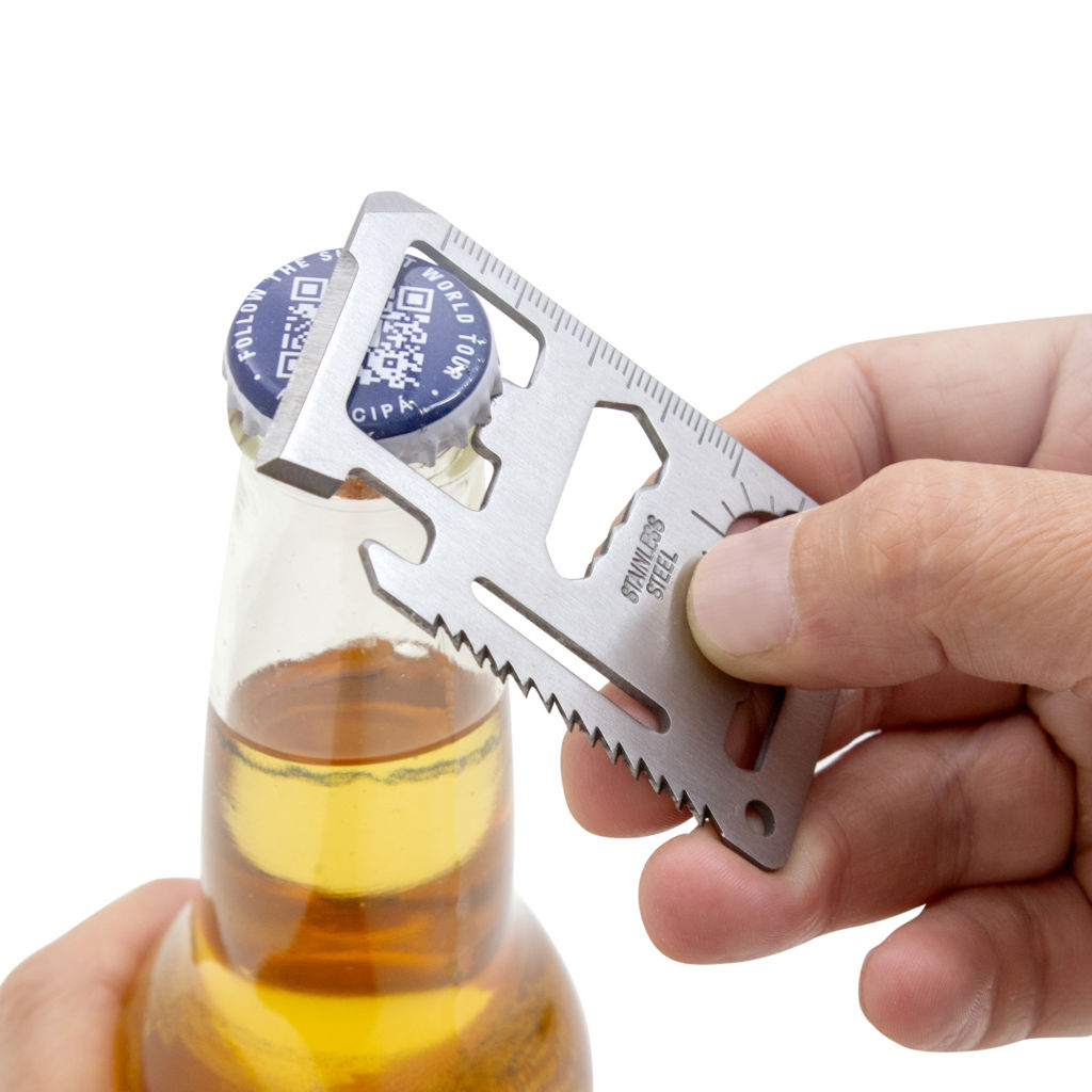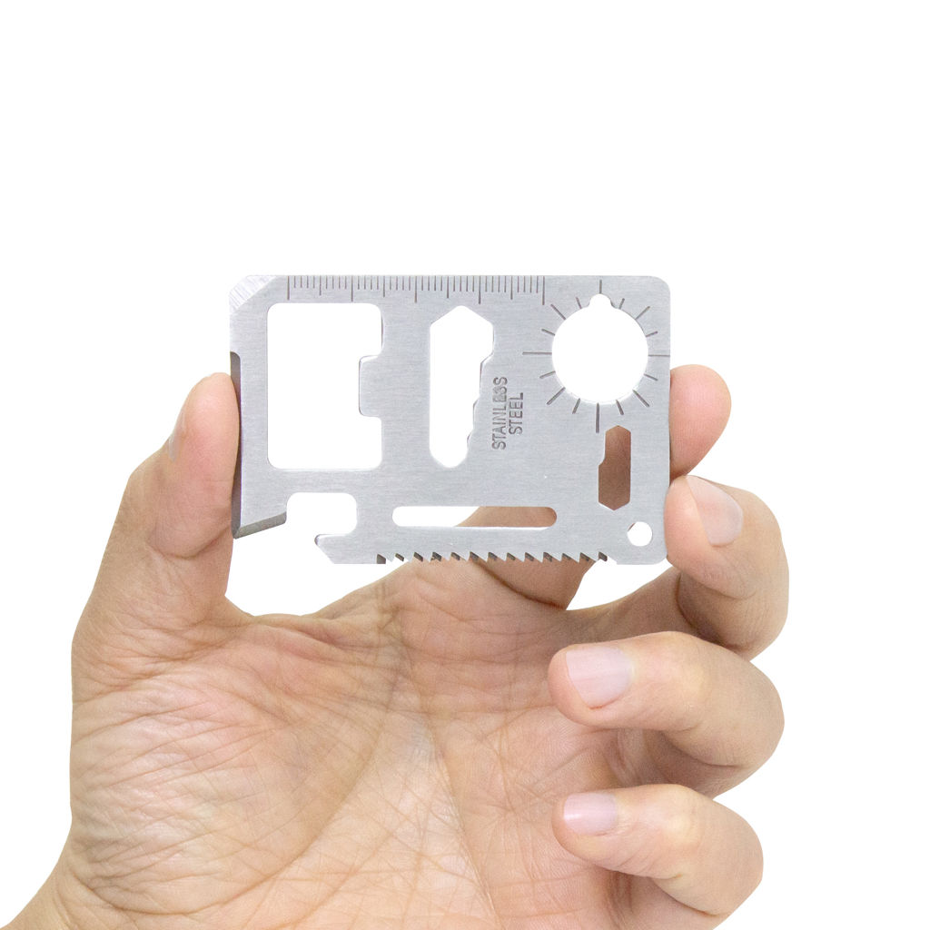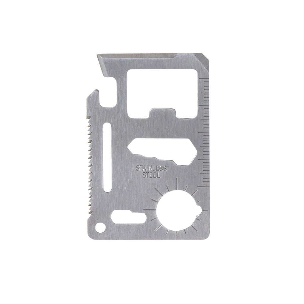 Prepárate para cualquier situación.Tarjeta multiherramienta de supervivencia portátil. Concentra 11 funciones en 1: abrelatas, cuchillo, destornillador plano, regla, abridor de botellas, llave inglesa de 4 posiciones, llave mariposa, llave inglesa de 2 posiciones, calibre de ángulos / indicador auxiliar de dirección para navegación / brújula auxiliar, sierra y orificio para cordón o llavero.Medidas: 7 x 4,5 x 1,7 cm.