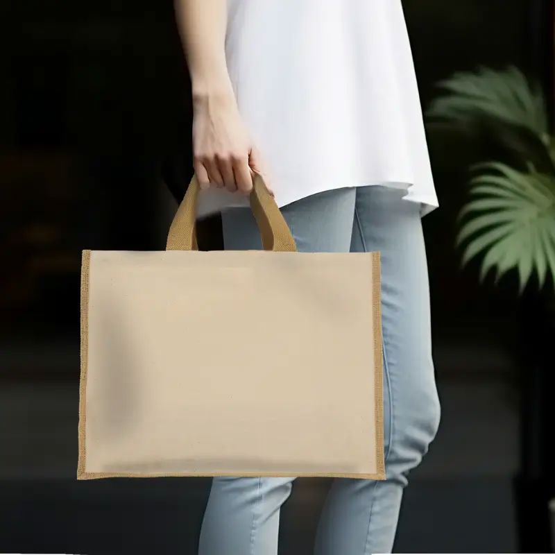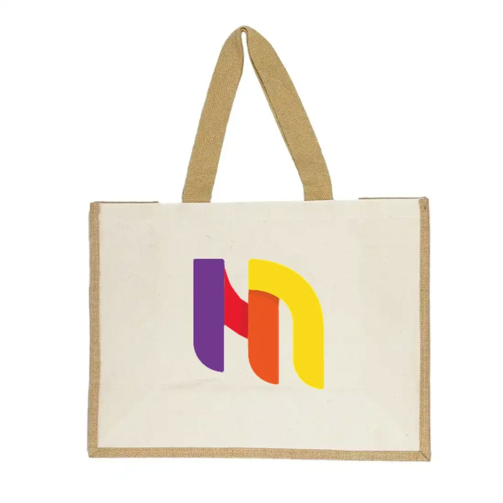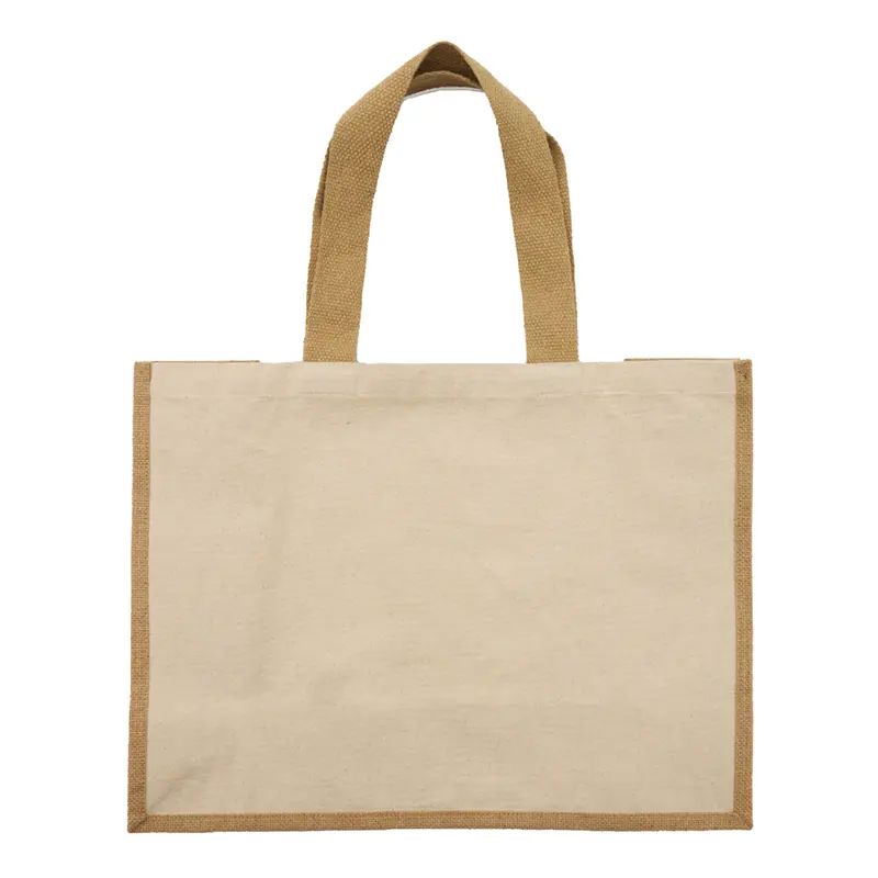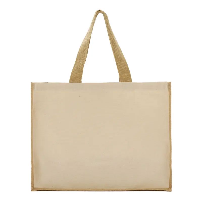 Tote bag fabricada en lona reciclada de 320gsm (10 oz) combinada con yute laminado natural 35 x 46 x 19 cm, en color natural.