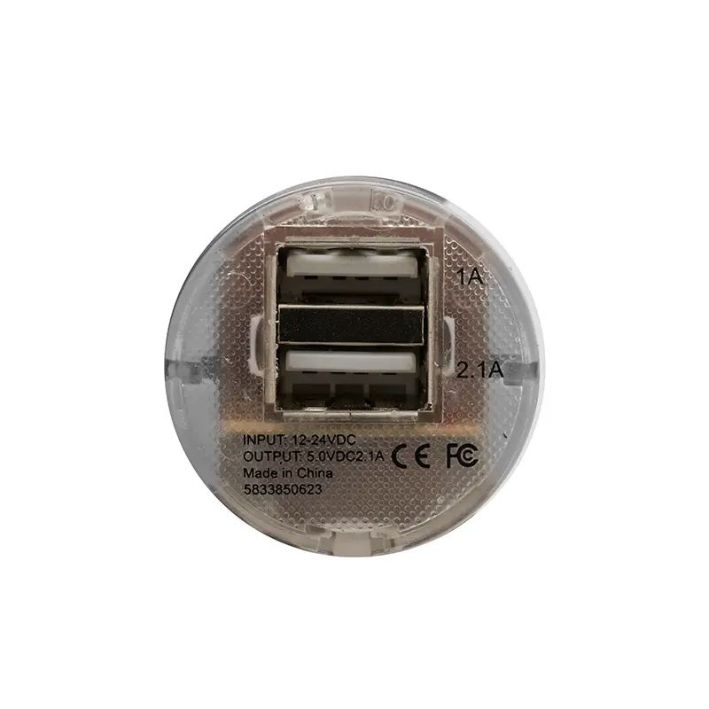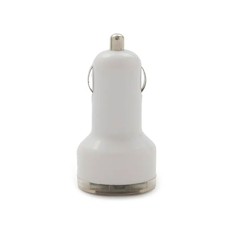 Cargador USB para automóvil en color blanco fabricado en ABS. Entrada de 12-24V y salida de 5V/1,5A. El producto viene en una caja de cartón. Dimensiones: 7,6 x 3,7 x 2,8 cm. Tahg