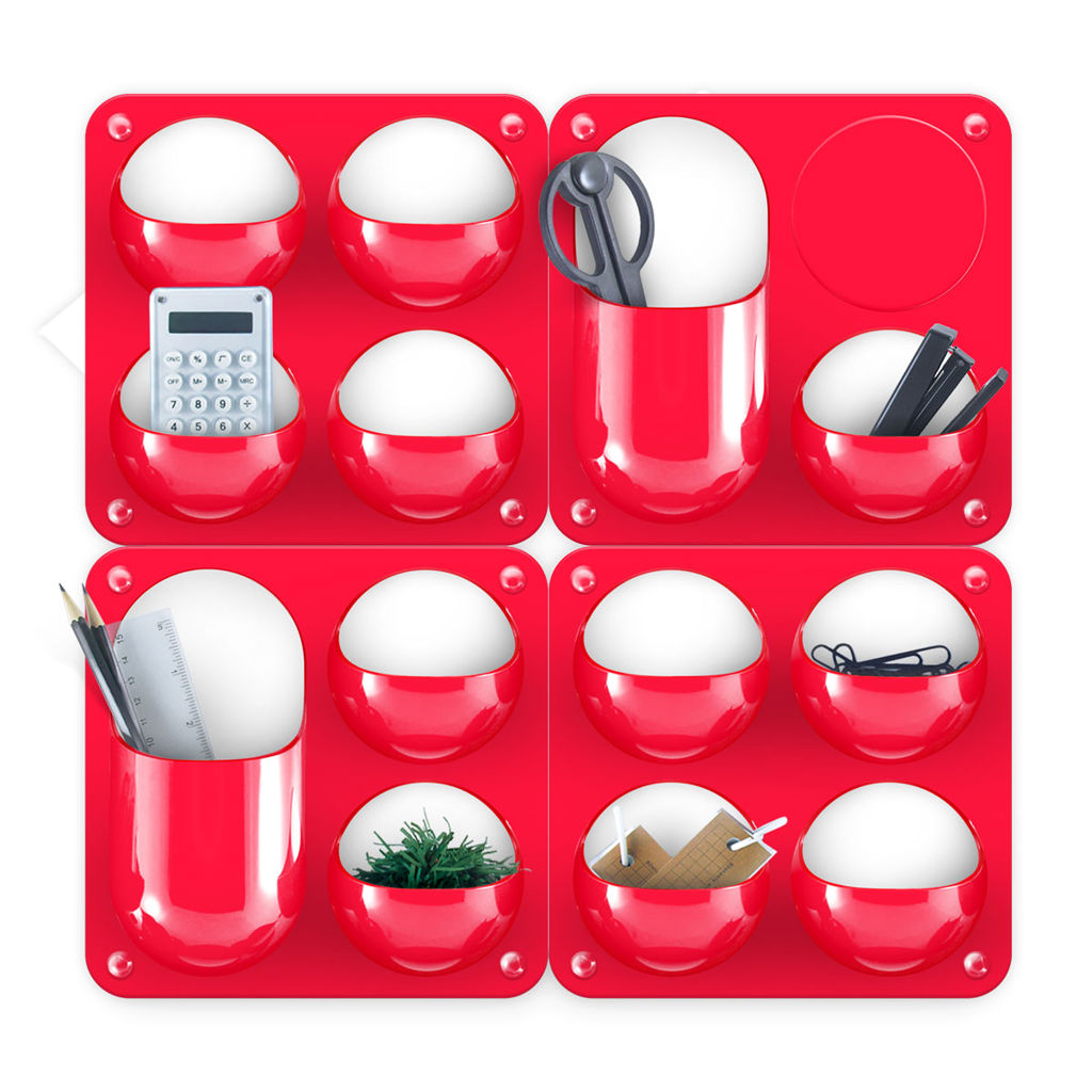 21 x 21 x 5 cm. Plástico. Sistema de contenedores modulares para organizar desde productos de escritorio hasta utensilios de cocina, artículos de baño o herramientas de jardinería. Puede ir apoyado, colgado, pegado o amurado. Incluye 1 ranura posterior para colgado, 2 patas para apoyo, 4 stickers para pegado y 4 tornillos + 4 tarugos para montado en pared. Presentación en caja de regalo.